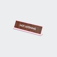 - Inscription "Not Listening" gravée sur fond bois et bordure rose