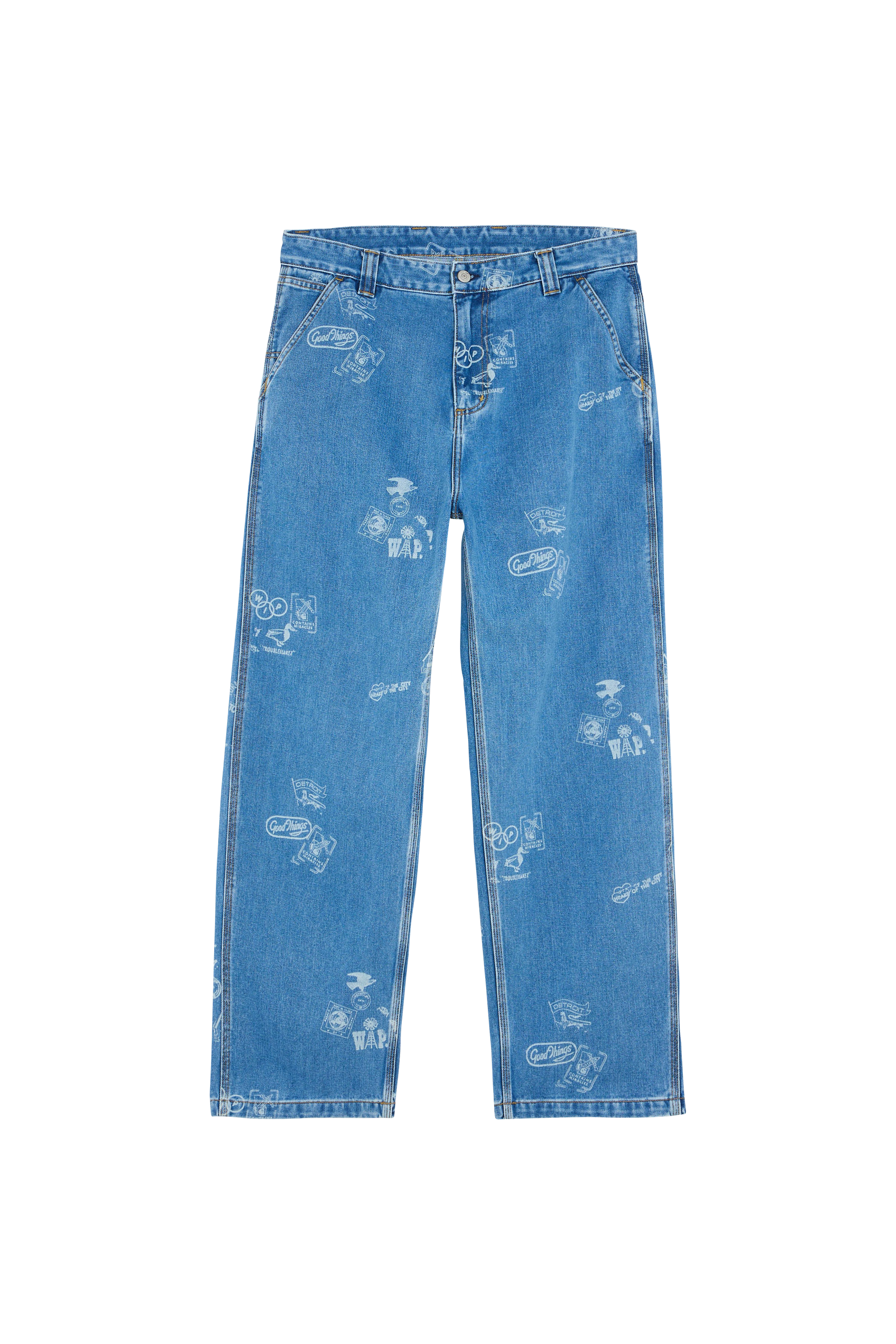 Loose tapered fit, regular waist, allover print, back yoke, triple stitched, bartack stitching at vital stress points, artificial leather square label, zip fly.