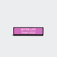 - Message "Better Late Than Ugly" engraved on a pink background with a black border