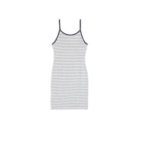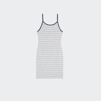 STRIPED SPAGHETTI MIDI DRESS. JERSEY STRIPE FABRIC. CONTOURS TO BODY SHAPE. SOLID RIBBING ON SPAGHETTI STRAPS, NECKLINE & ARMHOLES. OBEY EMBROIDERY ON SIDE CHEST. 100% COTTON. Sku: 401500417
